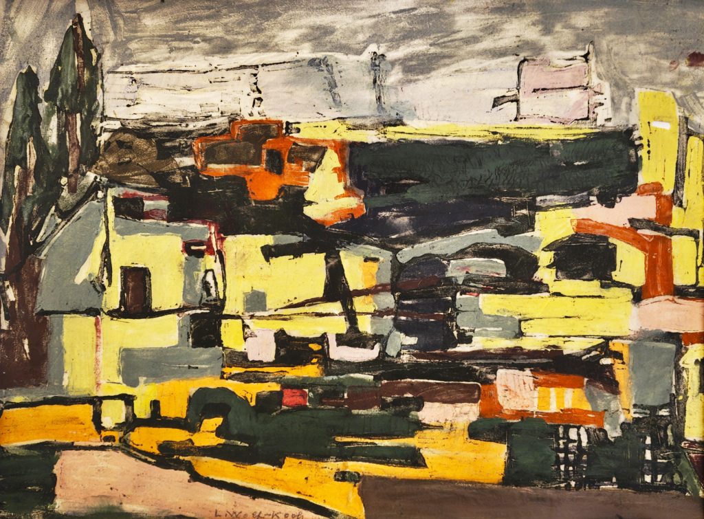 Lotte Wolf wurde 1909 in Kempten geboren. Sie studierte 1933/34, also während der Machtübernahme der Nationalsozialisten, an der Staatsschule für angewandte Kunst bei den Professoren: Emma Hoffmann, Max Körner, Karl Dotzler in Nürnberg. Gemäß der expressionistischen Ausrichtung ihrer Kunst hatte sie zu Beginn ihrer Laufbahn keine Chance, Fuß zu fassen, und begann ihre Arbeiten erst nach dem Zweiten Weltkrieg auszustellen. Ihr frühes Werk, bestehend aus Portraits, Landschaften und Stillleben, fällt demnach in die Zeit der Künstler der „Verlorenen Generation“, die sich nach dem Zweiten Weltkrieg oftmals der Abstraktion zuwandten, so auch Lotte Wolf. Nach ihrer Heirat, wohl ab 1975, nannte sie sich Lotte Wolf-Koch. Die teils harten Konturen der schwarzen Partien in der vorliegenden Arbeit und das sanfte Sich-Aufstülpen der Farbe entlang mancher Konturenränder lassen vermuten, dass Wolf die Arbeit in der Art einer Monotypie gestaltete, womit sie stilistisch eng an Künstler wie Otto Lange heranrückt. Ihr Oeuvre umfasst Werke in Öl, Aquarell, Pastell, Druckgrafiken entstanden meist als Linolschnitte. Stellt seit 1949 aus u.a. 1953 im Nürnberger Albrecht Dürer Verein sowie Sonderschau 1958 im Märk. Mus. in Witten, Rhur (ill. Kat.). Malte gegenständlich (Expressionistin) und abstrakt. Figürliches, Bildnisse, Landschaften, Stillleben. (Lit: Thieme-Becker Lexikon, Vollmer-Nachtrag, S. 814.)